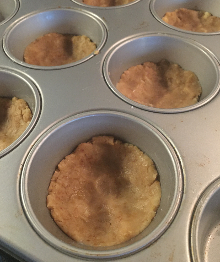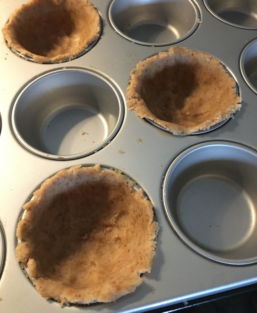 1. Teig dritteln oder sechsteln. Jedes Teigbällchen leicht flachdrücken. Im Muffinblech daraus drei Törtchen mit hohem Rand oder sechs Törtchenböden formen (siehe Bilder).
