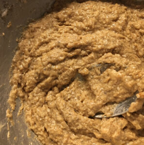 zugeben, alles gut mischen, bis eine homogene, dickflüssige Teigmasse entstanden ist.
