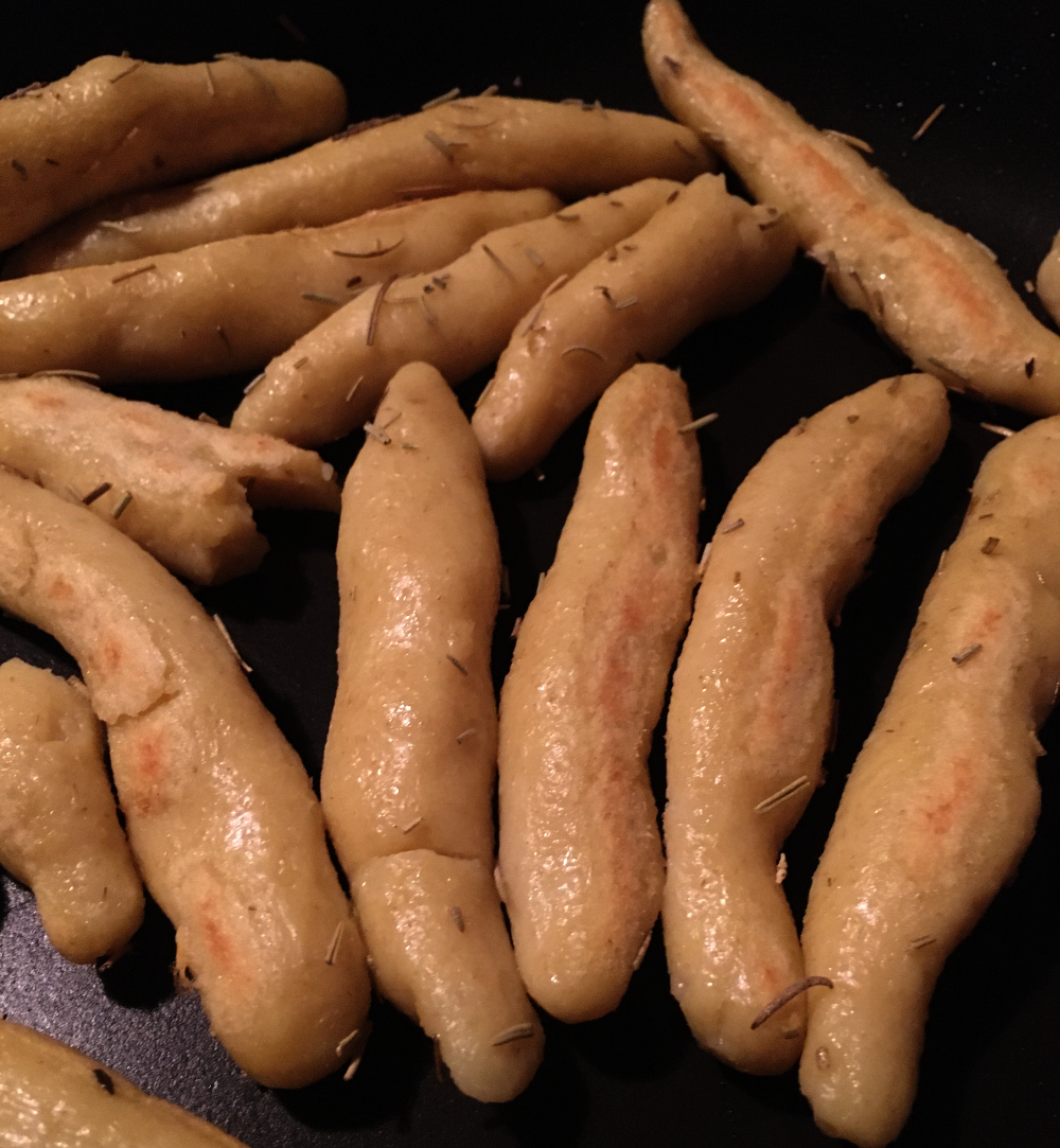 5. Teig in der Hand oder auf wenig Mehl zu kleinen Stücken formen. Auf der bemehlten Unterlage oder in der Hand zu etwa handbreite-langen Schupfnudeln formen, die an den Enden auslaufen.
