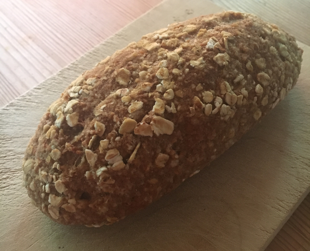 - Teig zu einem Brot formen. Damit der Teig nicht auf der Unterlage klebt, Mehl oder Flocken verwenden. Ich verwende gern Hafer- oder Hirseflocken.