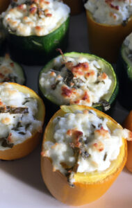 Die Zucchini-Röschen oder -Röhren mit dem Käsemix füllen und im vorgeheizten Ofen ca. 20 Minuten bei 225 Grad Mittelhitze backen, die letzten fünf Minuten mit Grill und ein klein wenig geöffnetem Ofen, damit der Dampf abziehen kann. Die Füllung soll ein wenig braun und knusprig sein.
