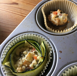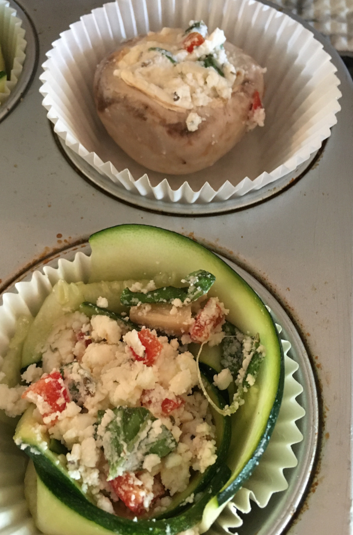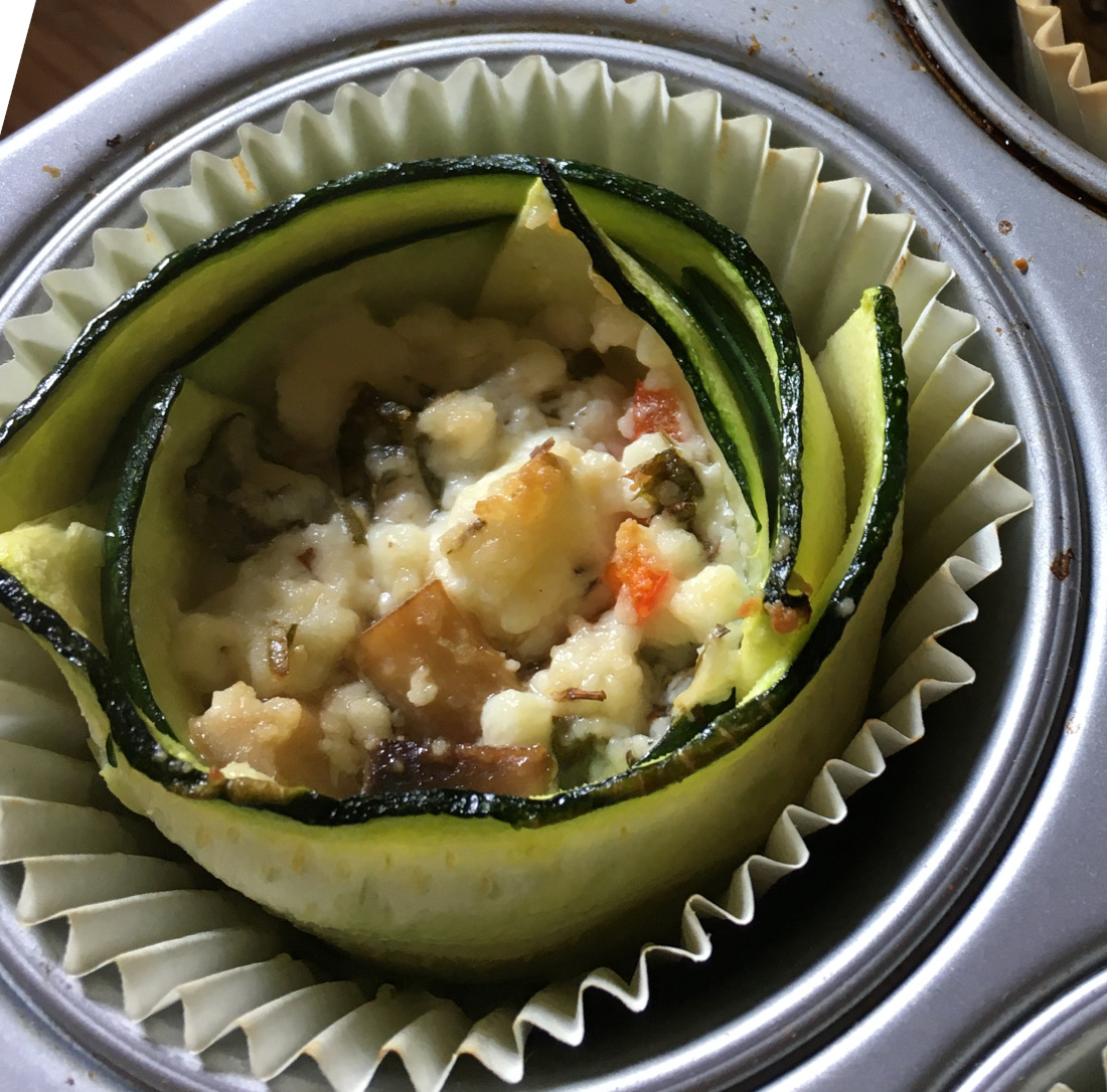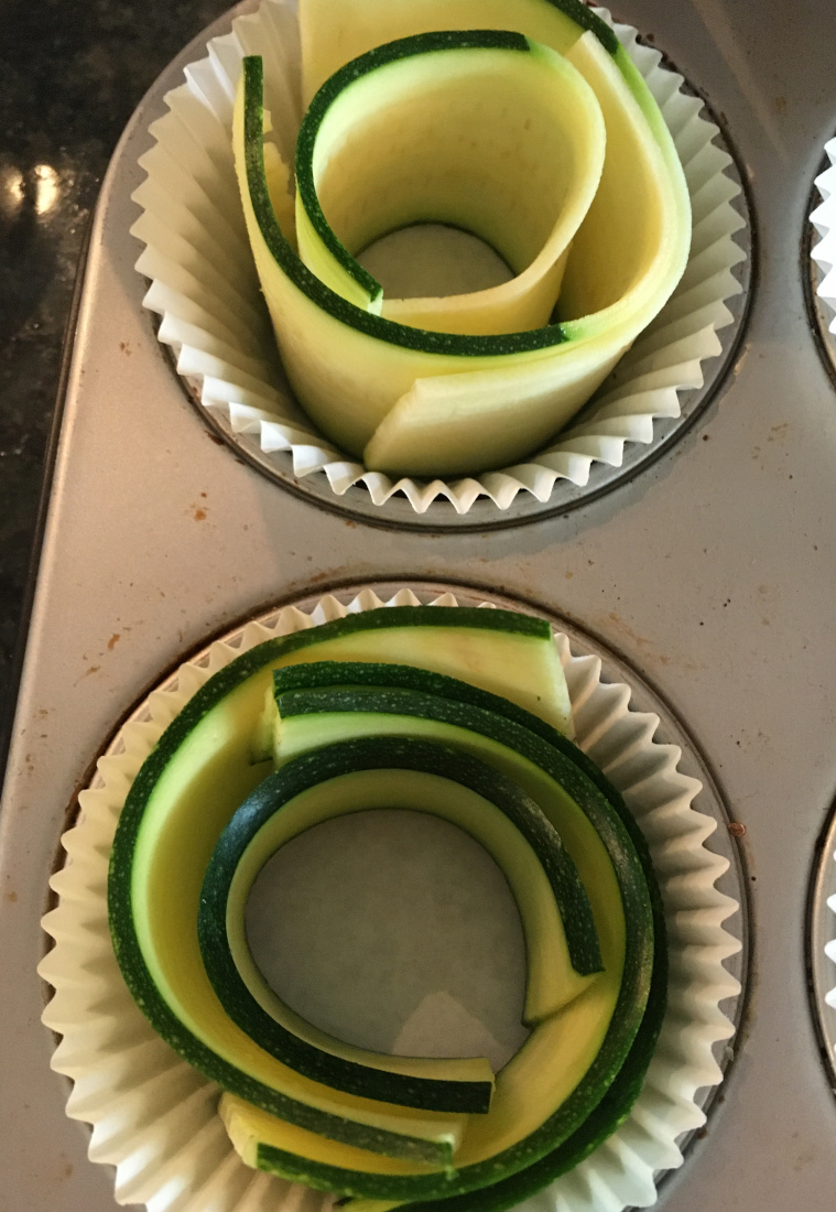 • 1-2 Zucchini: je nach Größe (ca. 280 g) längs gehobelt zu Röschen rollen und in Muffinsförmchen >