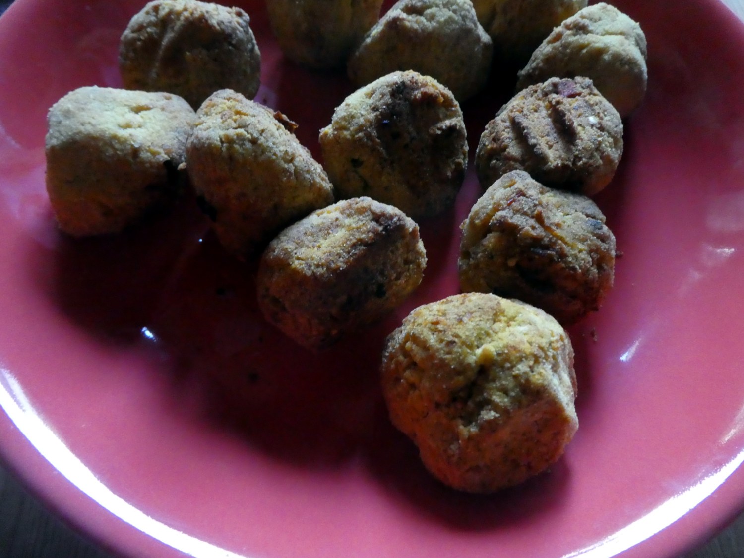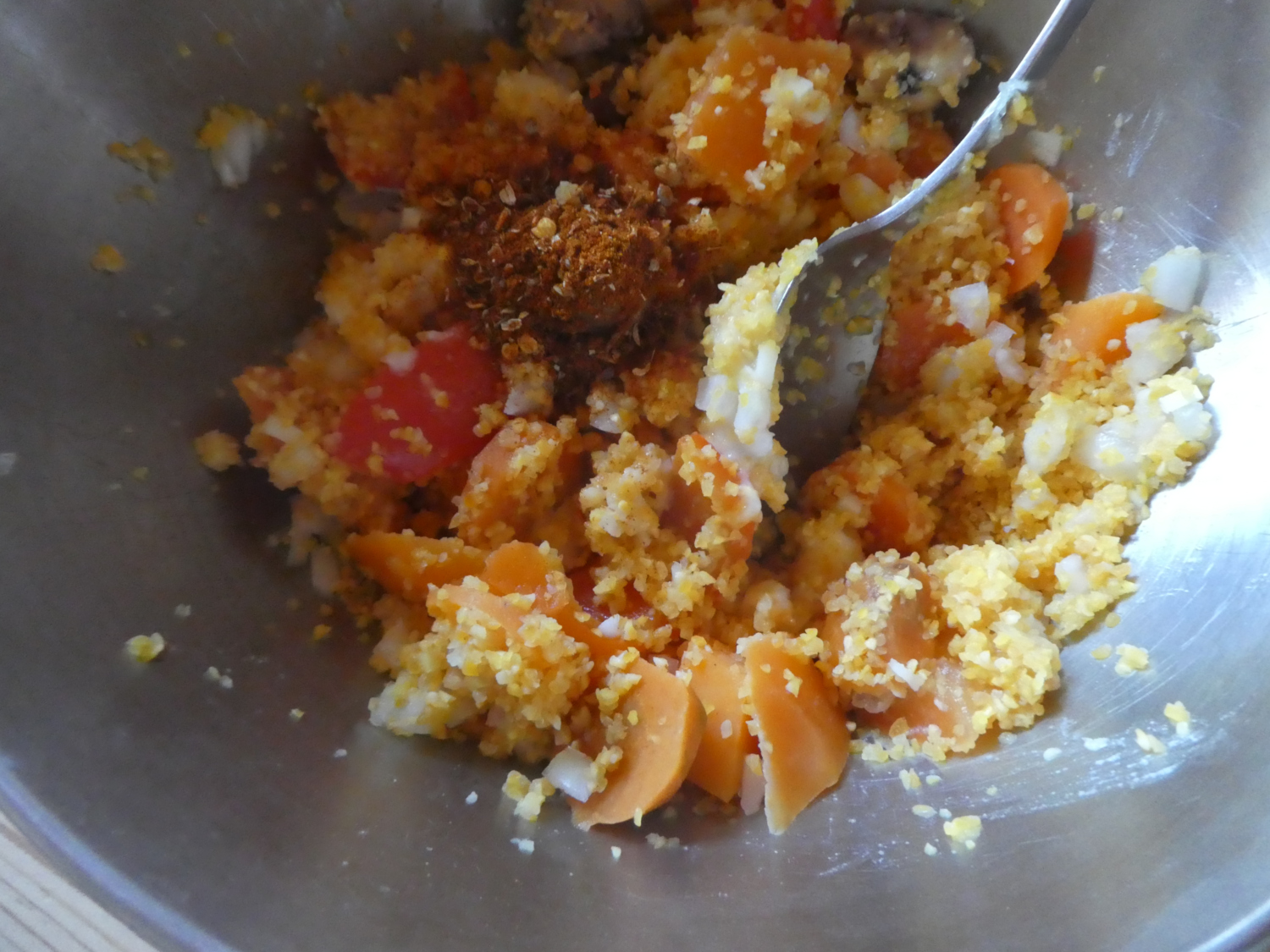 Ebenfalls als Basis vorstellen könnte ich mir vorgekochten Reis statt Couscous. Anstelle von Haferflocken und/oder Paniermehl ließen sich bestimmt auch andere Flocken (Hirse, Dinkel) verwenden. Die Textur sollte leicht krümmelig sein, um an Kichererbsen zu erinnern.
