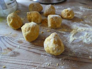 1. Auf der mit Maismehl bemehlten Arbeitsfläche Kugeln formen.