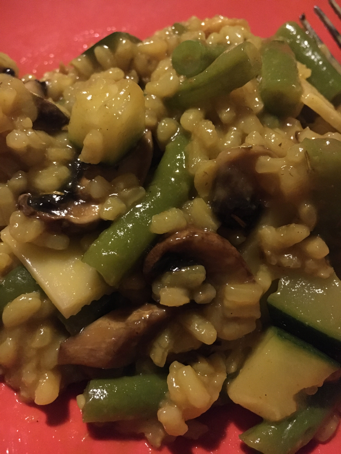 Risotto lässt sich mit allen möglichen Gemüsekombiationen zubereiten. Und natürlich auch ganz ohne Gemüsezugaben. Manche mischen Käse oder Käseersatz unter, andere streuen Käse(-Ersatz) erst am Tisch drüber.