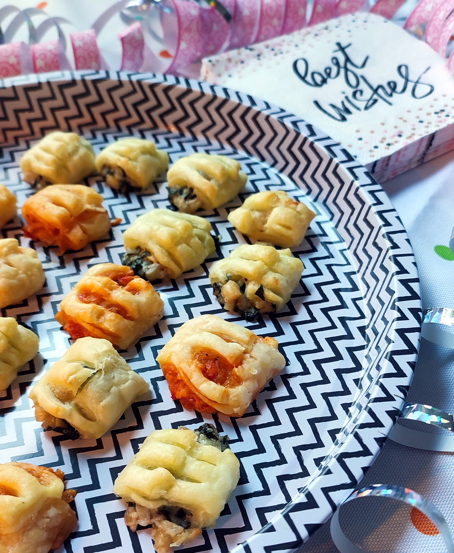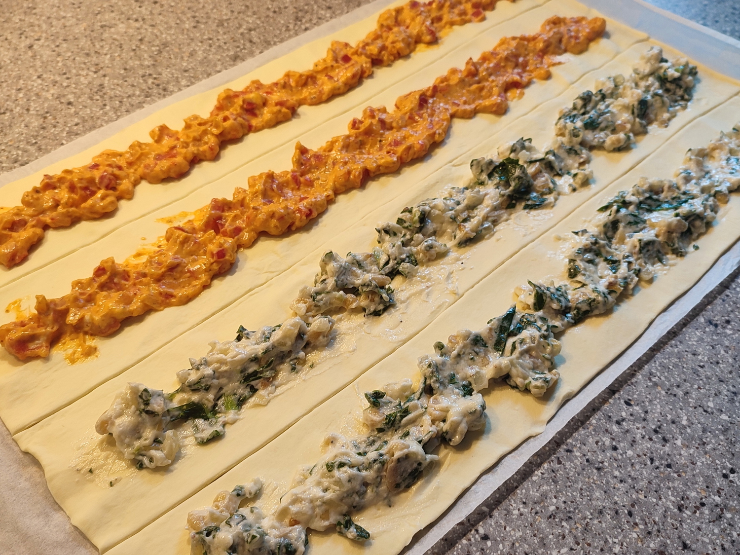 [Astrid] Kleine Blätterteig-Häppchen mit einer roten und einer grünen Füllung. Und obwohl ich bei sowas immer ein wenig tollpatschig bin (ich wette, geschickte Köch*innen kriegen das viel schöner hin), sehen sie nicht nur hübsch aus, sondern machen sich gut bei einer Party auf dem Buffet und sind auch so ein toller Snack für zwischendurch.