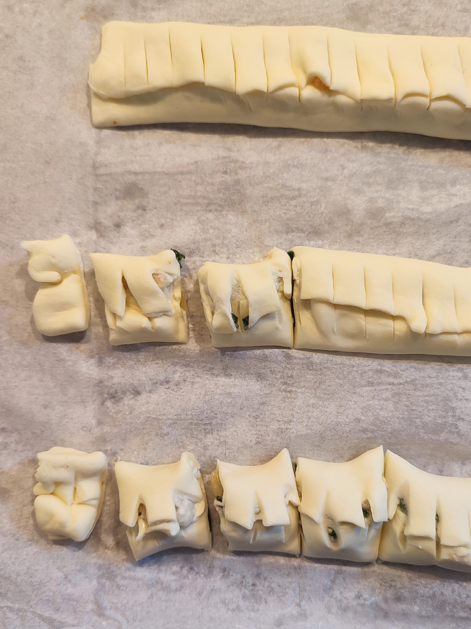 12. Kleine Querschnitte in die Rollen schneiden, entweder mit einem scharfen Messer oder noch besser mit einer Rasierklinge. Die Rollen (am besten auch mit einem Pizzaroller) in kleine quadratische Häppchen schneiden.