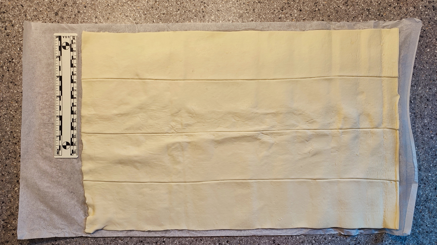 9. Die Blätterteigrolle ausbreiten und (am besten mit einem Pizzaroller) längs in 4 Streifen schneiden. Je nach Blätterteig werden die Streifen ungefähr 6cm breit.