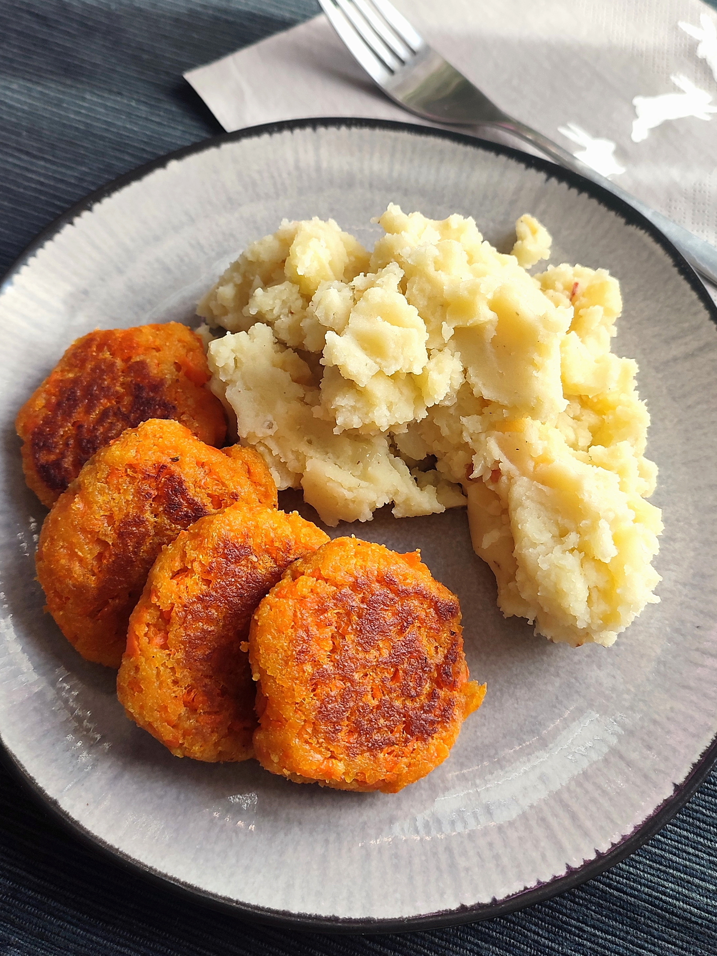 - Dazu passt gut Kartoffelpüree, ich habe meines noch zusätzlich mit in (veganer) Butter angebratenen Zwiebel- und Apfelwürfelchen gepimpt.